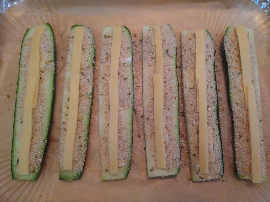 so, while I was at aldi, I picked up a pkg of zucchini and this is my fav way to prepare it. I slice it thin, length ways and put it on parchment paper on a baking sheet and add just a dot of butter on each piece, a sprinkle of parm bread crumbs and this had a slice of gouda cheese cut in real thin strips. I popped it in the counter top oven on 350* and baked for about 25 minutes and it was fabulous!!!!!!