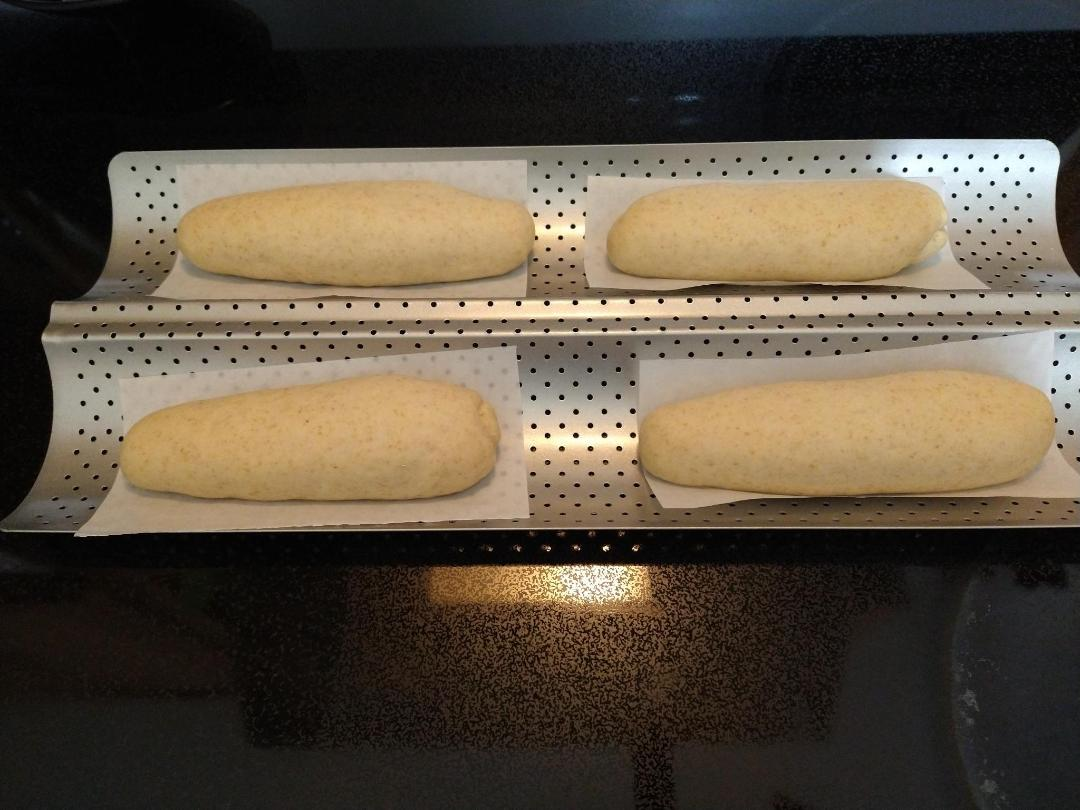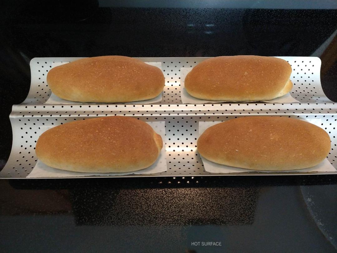 but when they are done baking, you can see that they are beautiful!!! our favorite meal from these are using the Aldi chicken apple sausage. the sausages are pretty large, so I'll thaw one sausage out and cut it in half down the middle lengthways and we'll each get a half of a sausage on our bun and that is plenty. I'll put the sausage in the air fryer along with our potato and sweet potato bites that I make and keep frozen in the freezer. this makes for a really good meal and relatively quick. it's another of what I call my "fast food" options. I hope if you haven't tried making long buns before that you'll be inspired to give it a try. this is just one more item that I can make, that I don't even have to think about buying at the store. I haven't bought bread at the store in years, and I pray that I never have to buy store bought again!!
